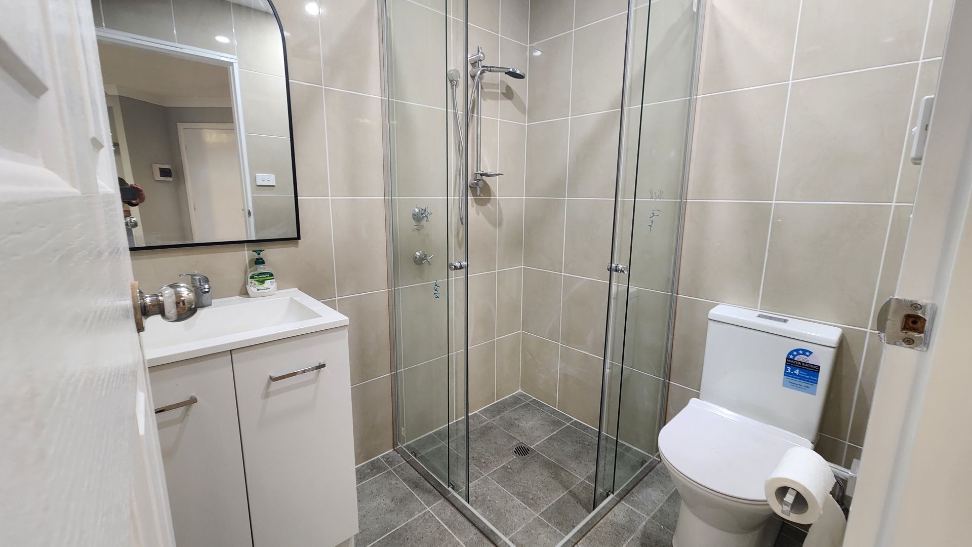 - Neat and tidy bathroom with floor-to-ceiling tiles