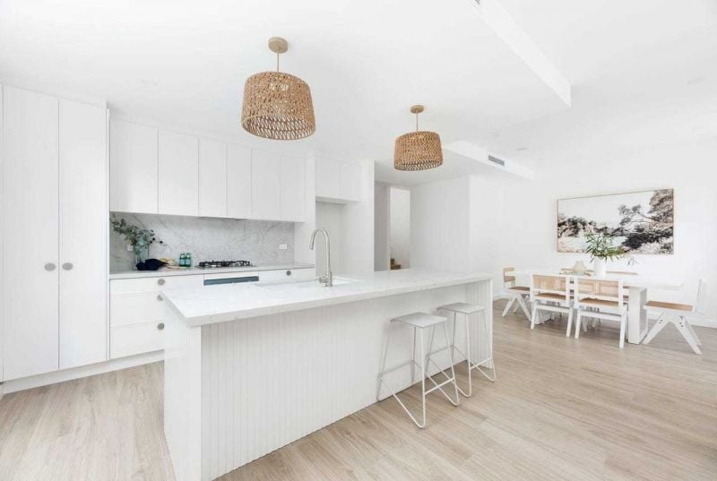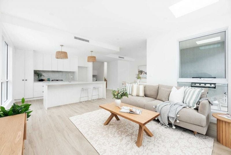 - Light-filled open plan living area with skylights